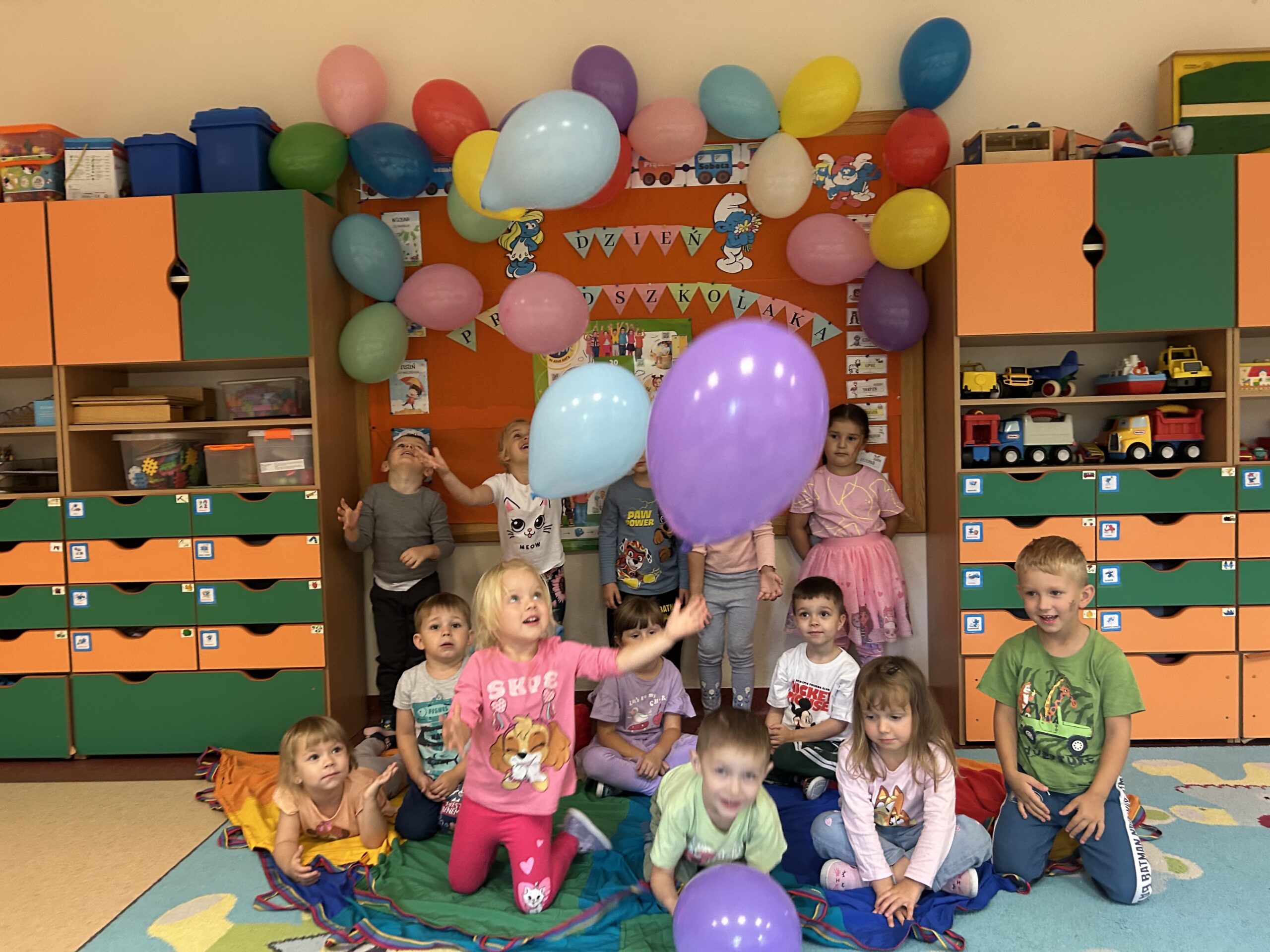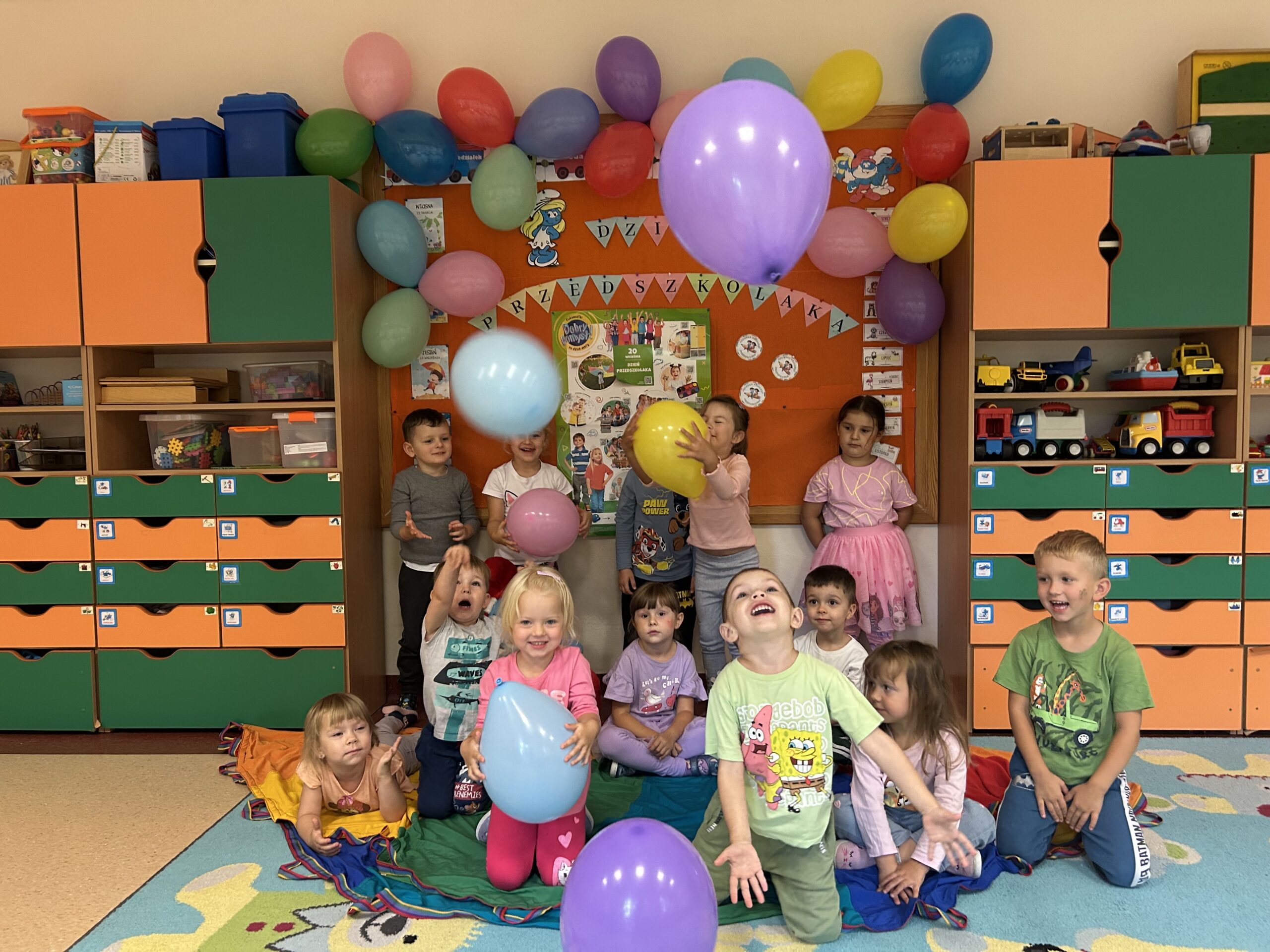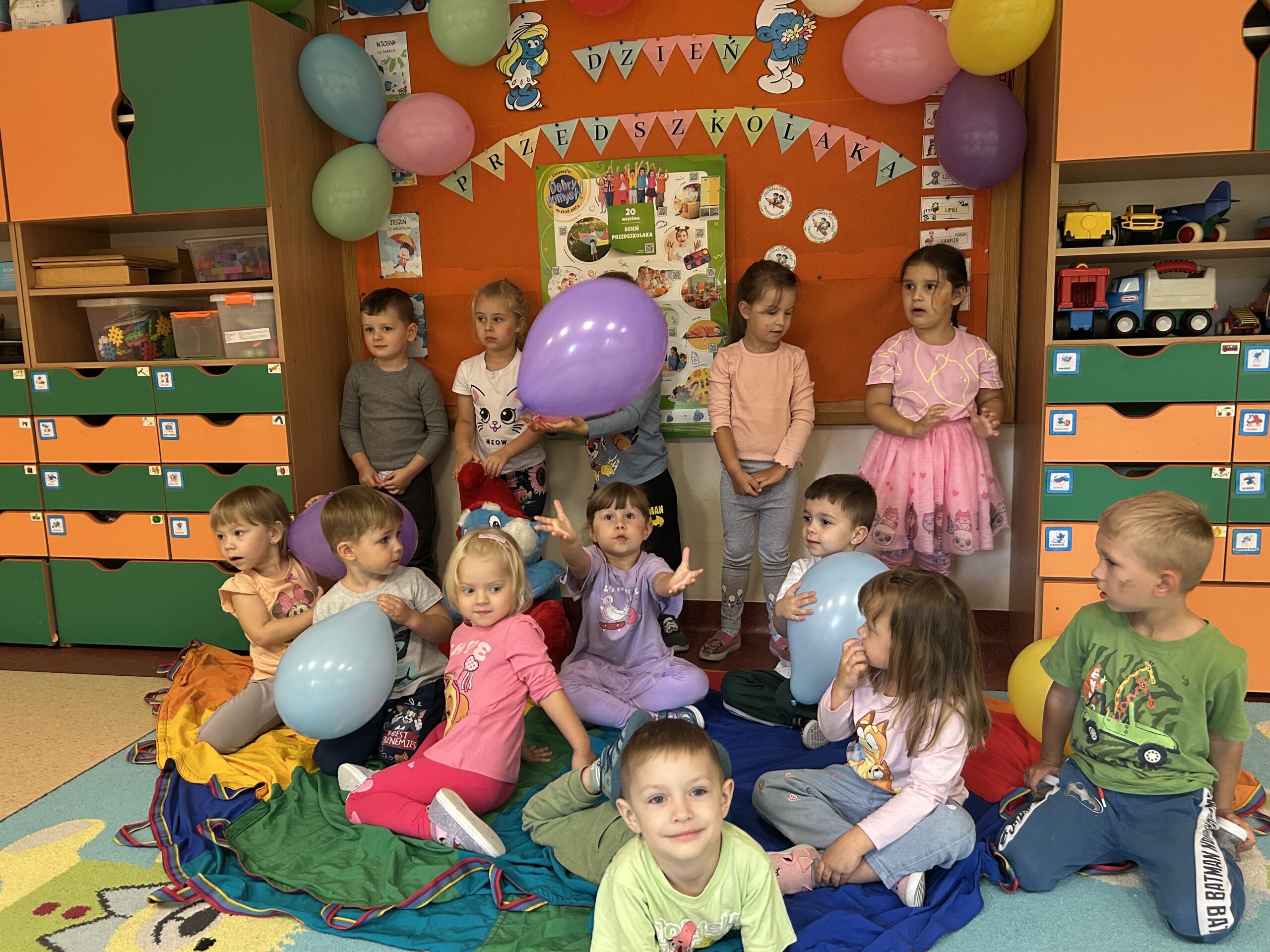 Od samego rana w sali panowała niezwykła atmosfera. Dzieci z entuzjazmem uczestniczyły w zabawach ruchowych i integracyjnych z wykorzystaniem chusty animacyjnej, która zawsze dostarcza mnóstwo emocji i śmiechu. Nie zabrakło również tańców z balonami, które wywołały prawdziwą falę radości. Na podwórku dzieci mogły dać upust swojej kreatywności, tworząc kolorowe rysunki kredą, które ozdobiły przedszkolny plac.