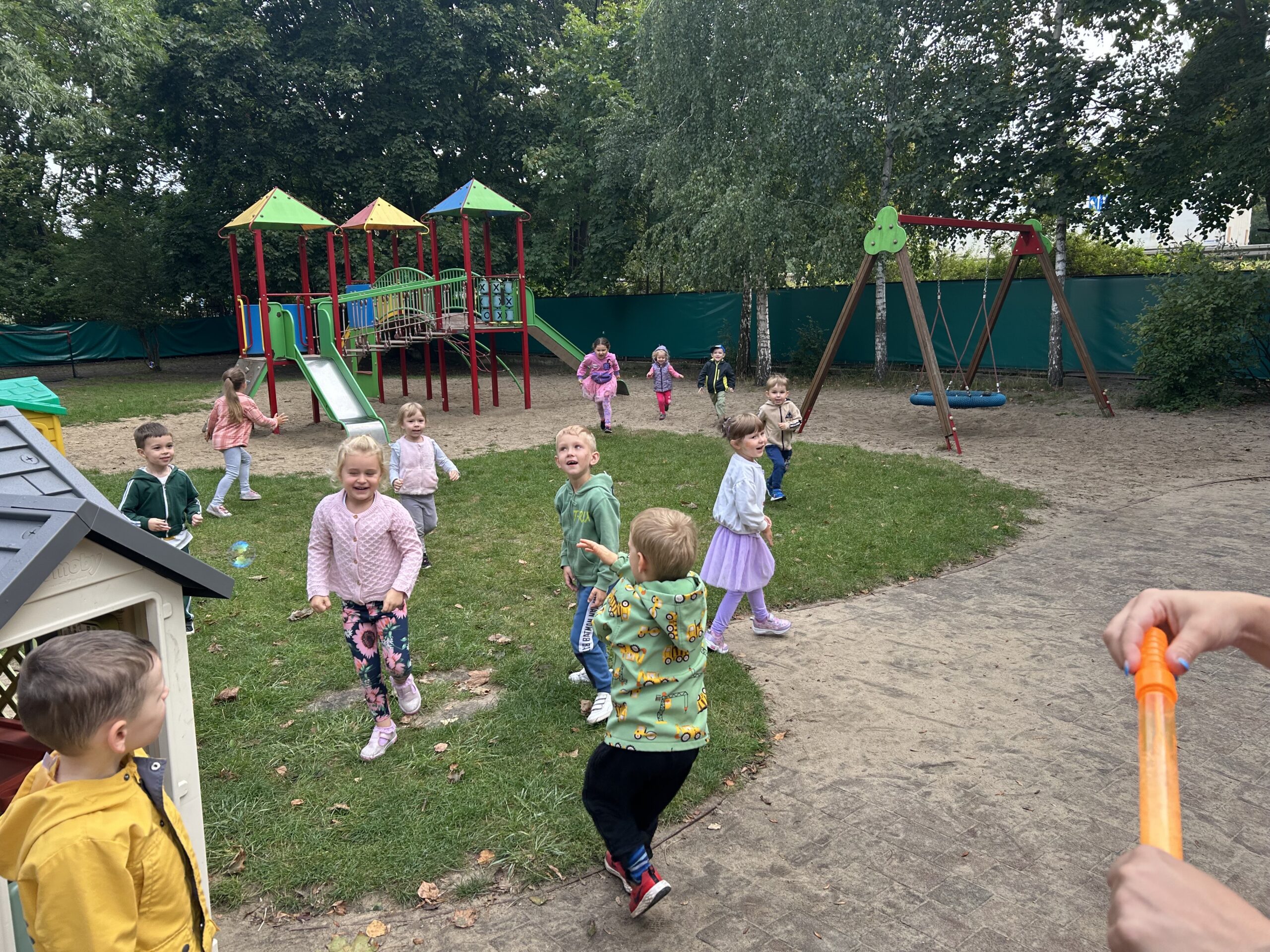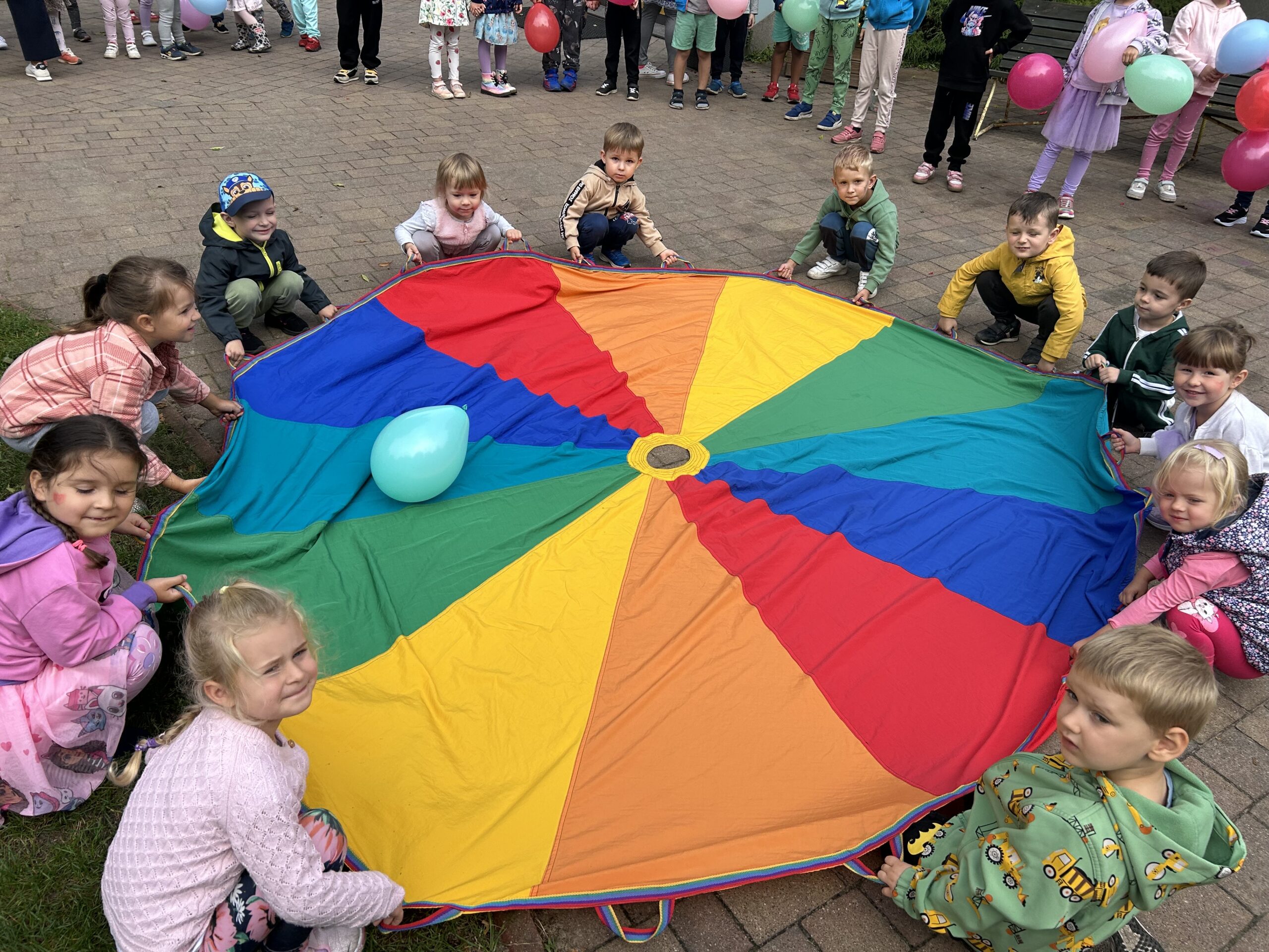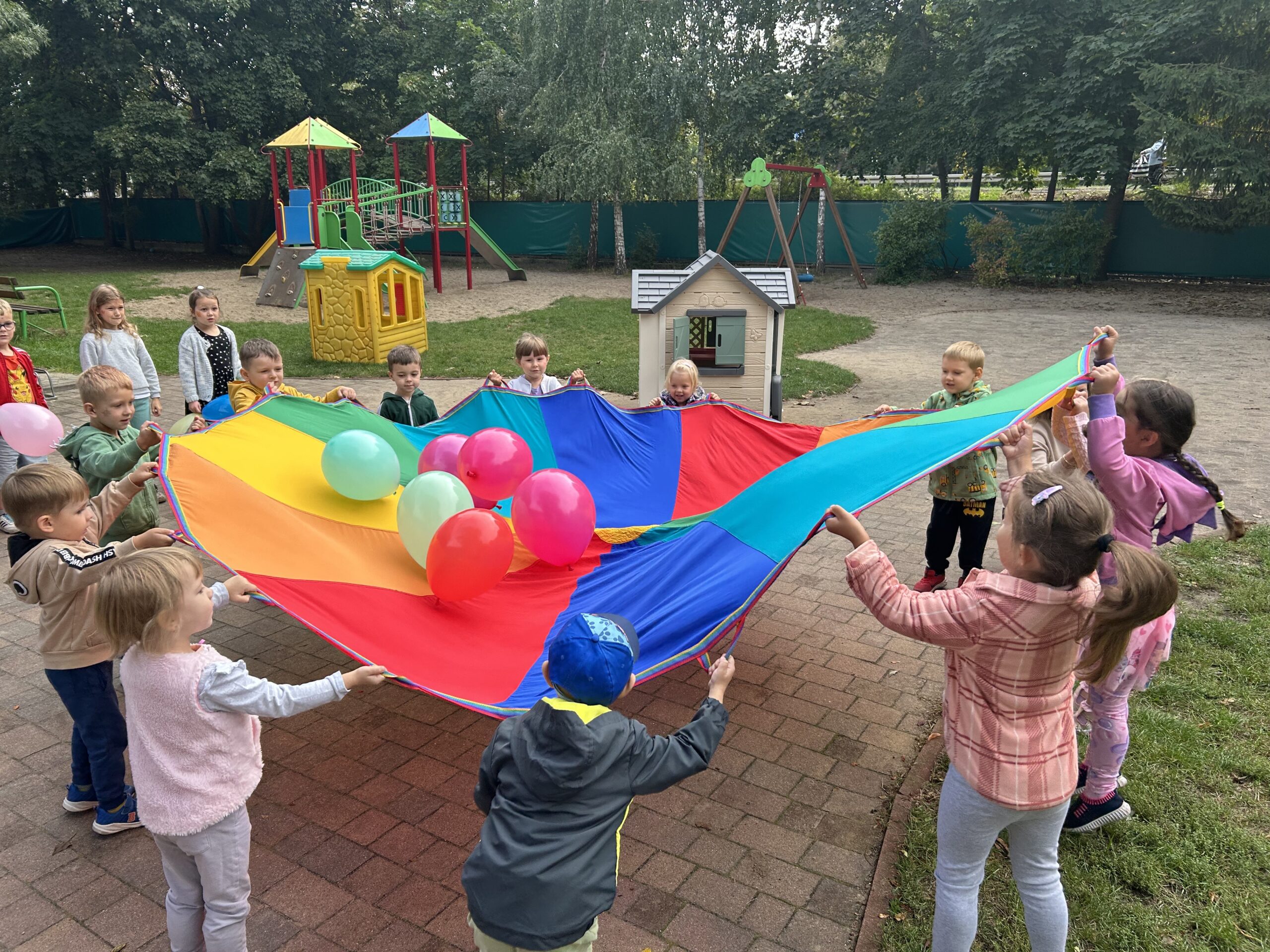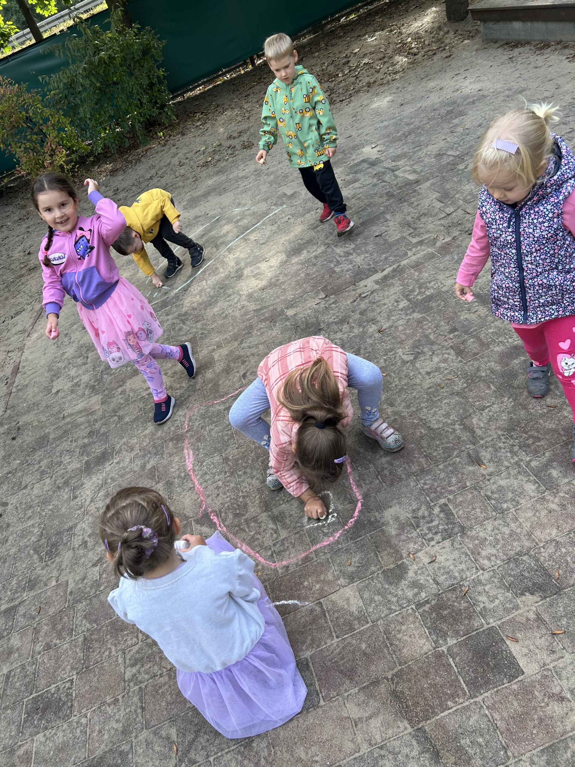 Od samego rana w sali panowała niezwykła atmosfera. Dzieci z entuzjazmem uczestniczyły w zabawach ruchowych i integracyjnych z wykorzystaniem chusty animacyjnej, która zawsze dostarcza mnóstwo emocji i śmiechu. Nie zabrakło również tańców z balonami, które wywołały prawdziwą falę radości. Na podwórku dzieci mogły dać upust swojej kreatywności, tworząc kolorowe rysunki kredą, które ozdobiły przedszkolny plac.