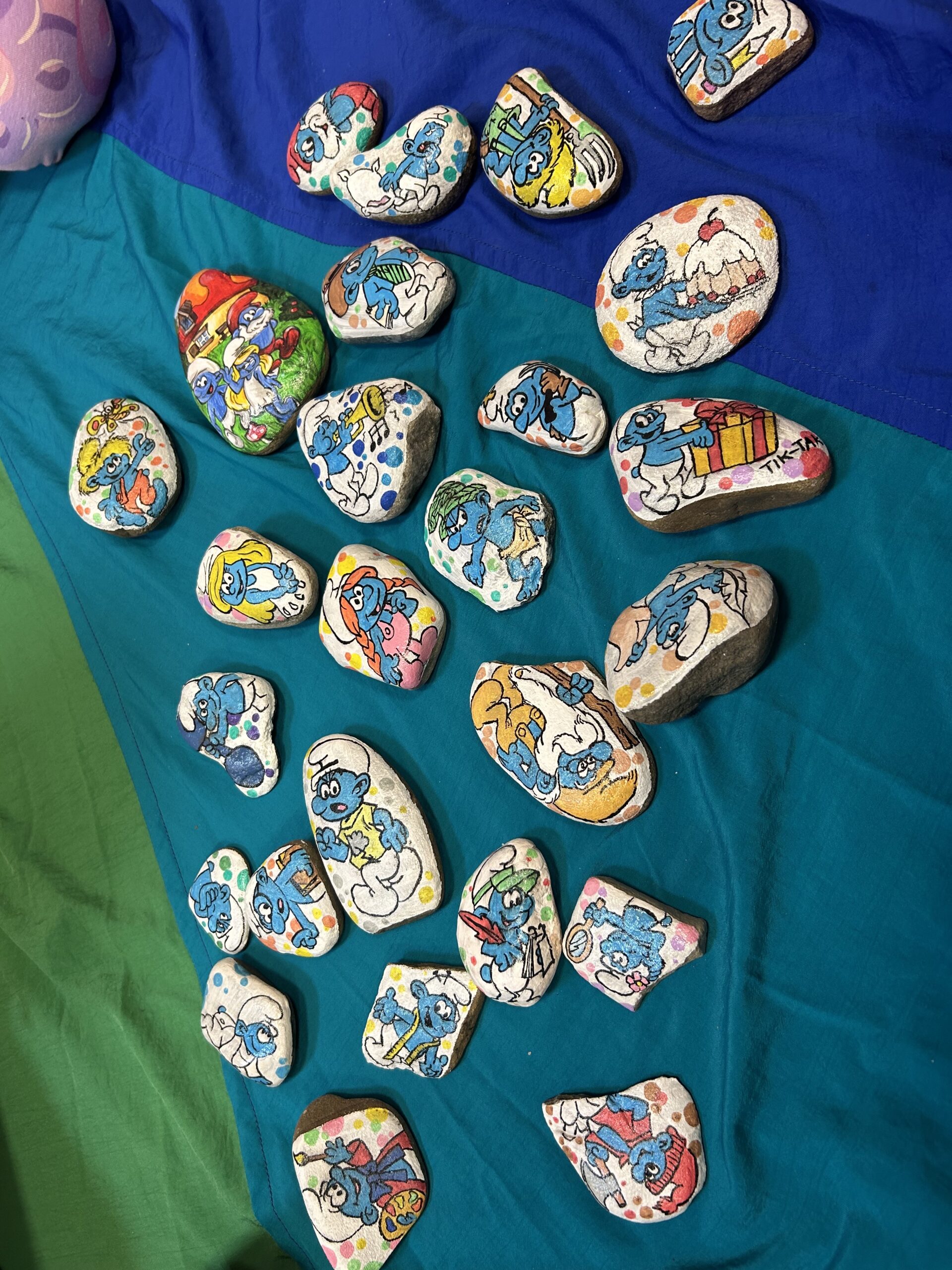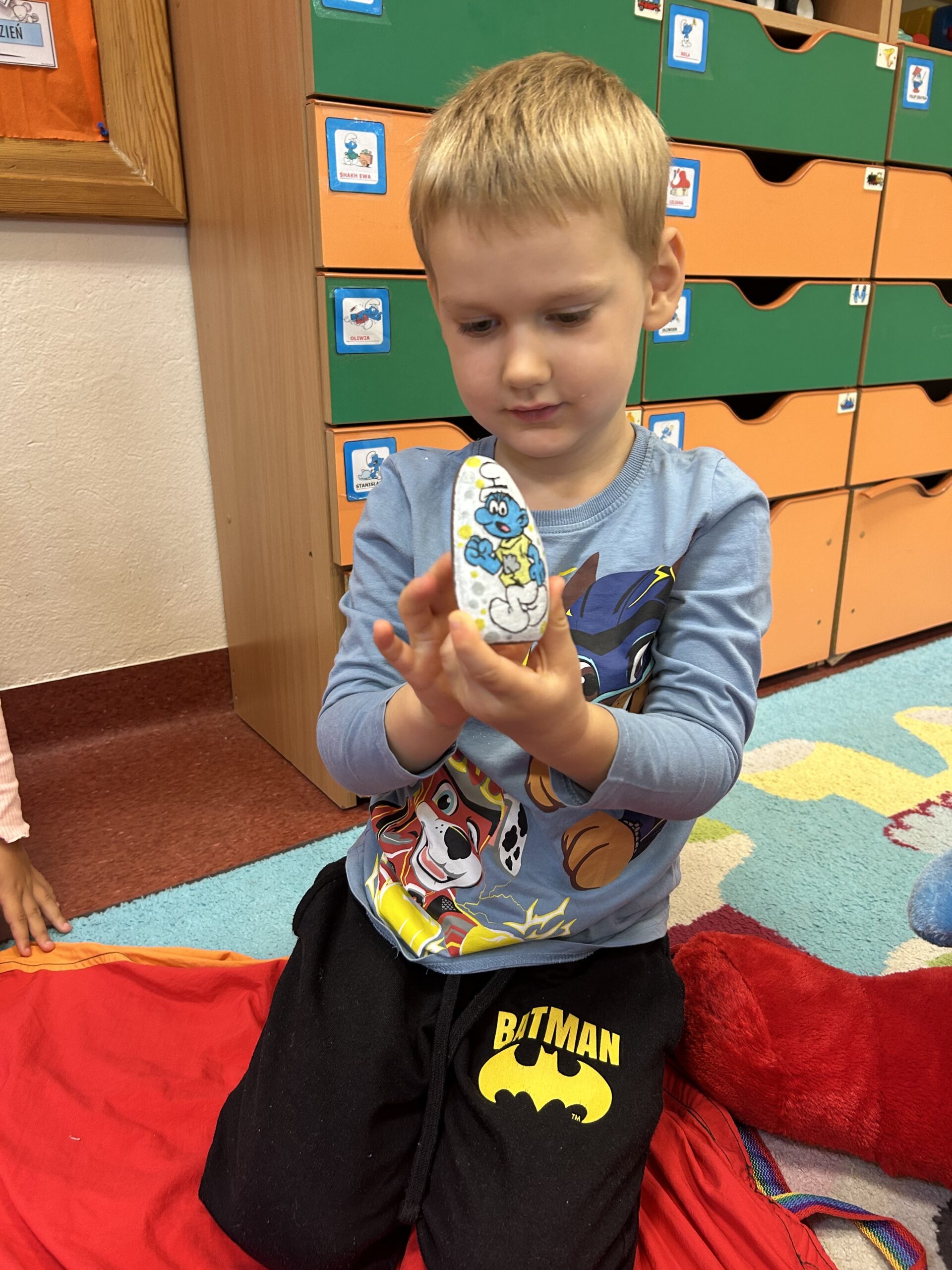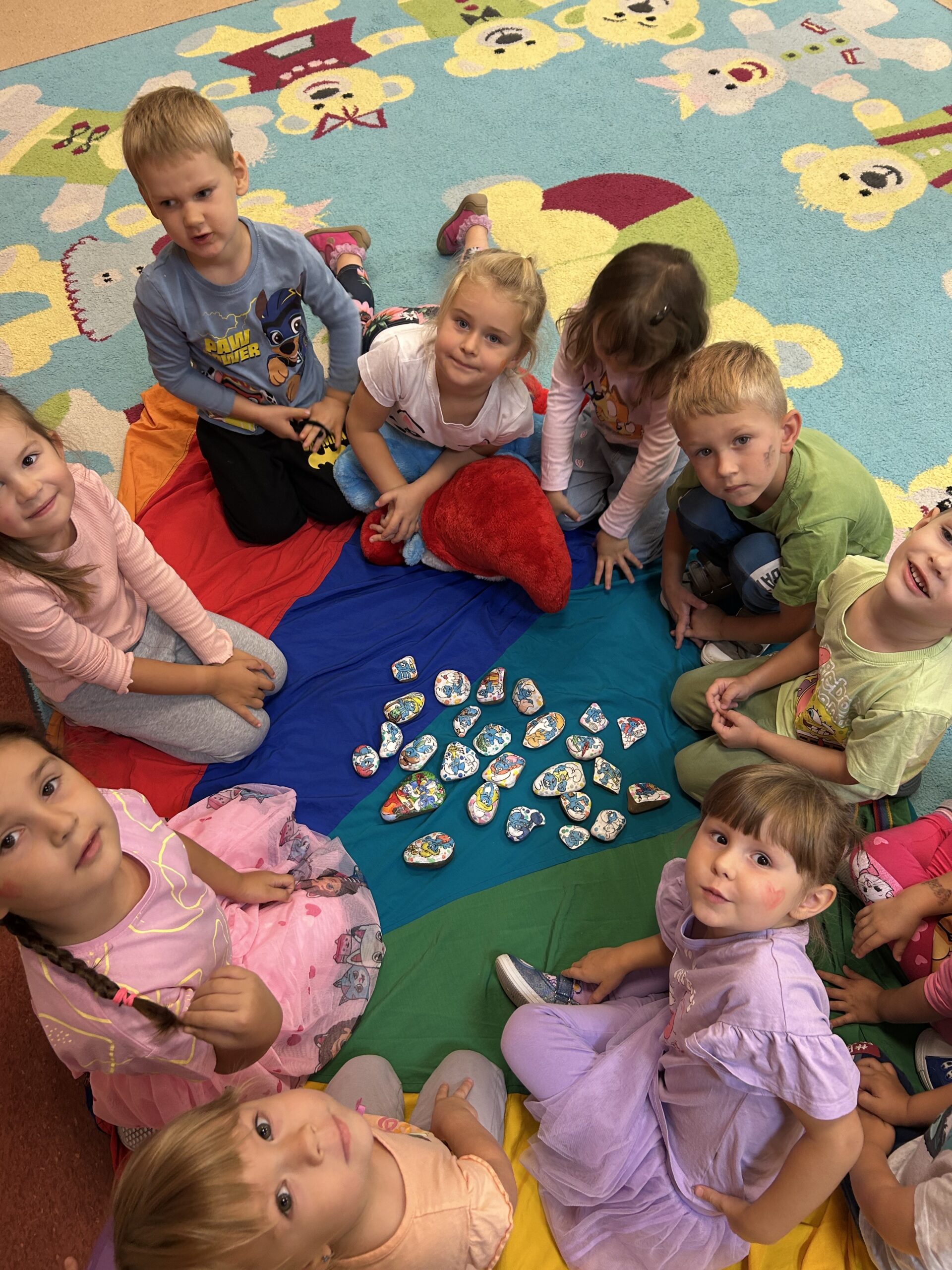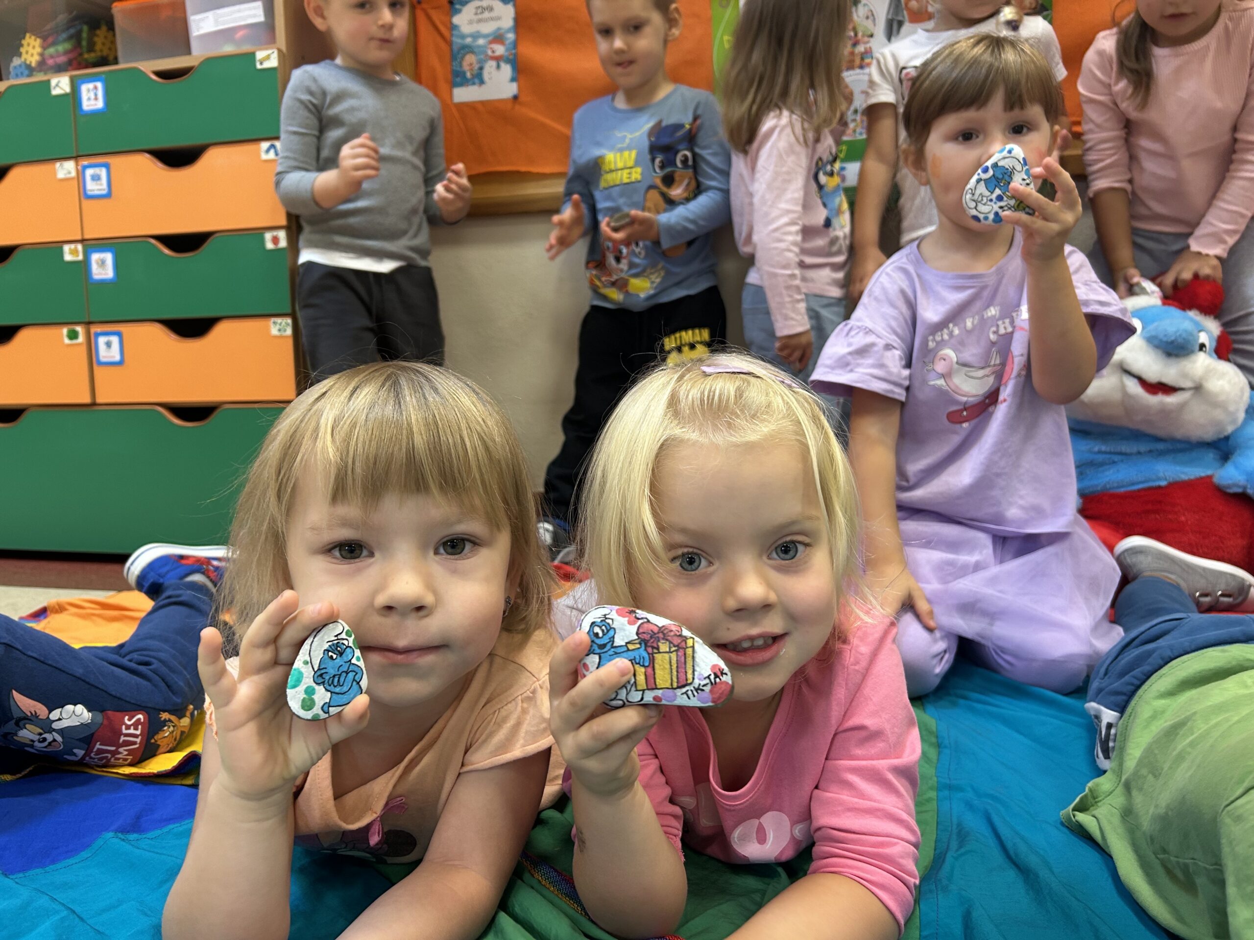 Największą niespodzianką tego dnia był jednak prezent przygotowany przez mamę Stasia – Panią Agnieszkę Szarubkę, niezwykle utalentowaną artystkę. Pani Agnieszka podarowała każdemu dziecku wyjątkową pamiątkę – smerfa namalowanego na kamieniu. Każdy kamyk był niepowtarzalny i wykonany z ogromnym sercem, a dzieci przyjęły je z prawdziwym zachwytem.