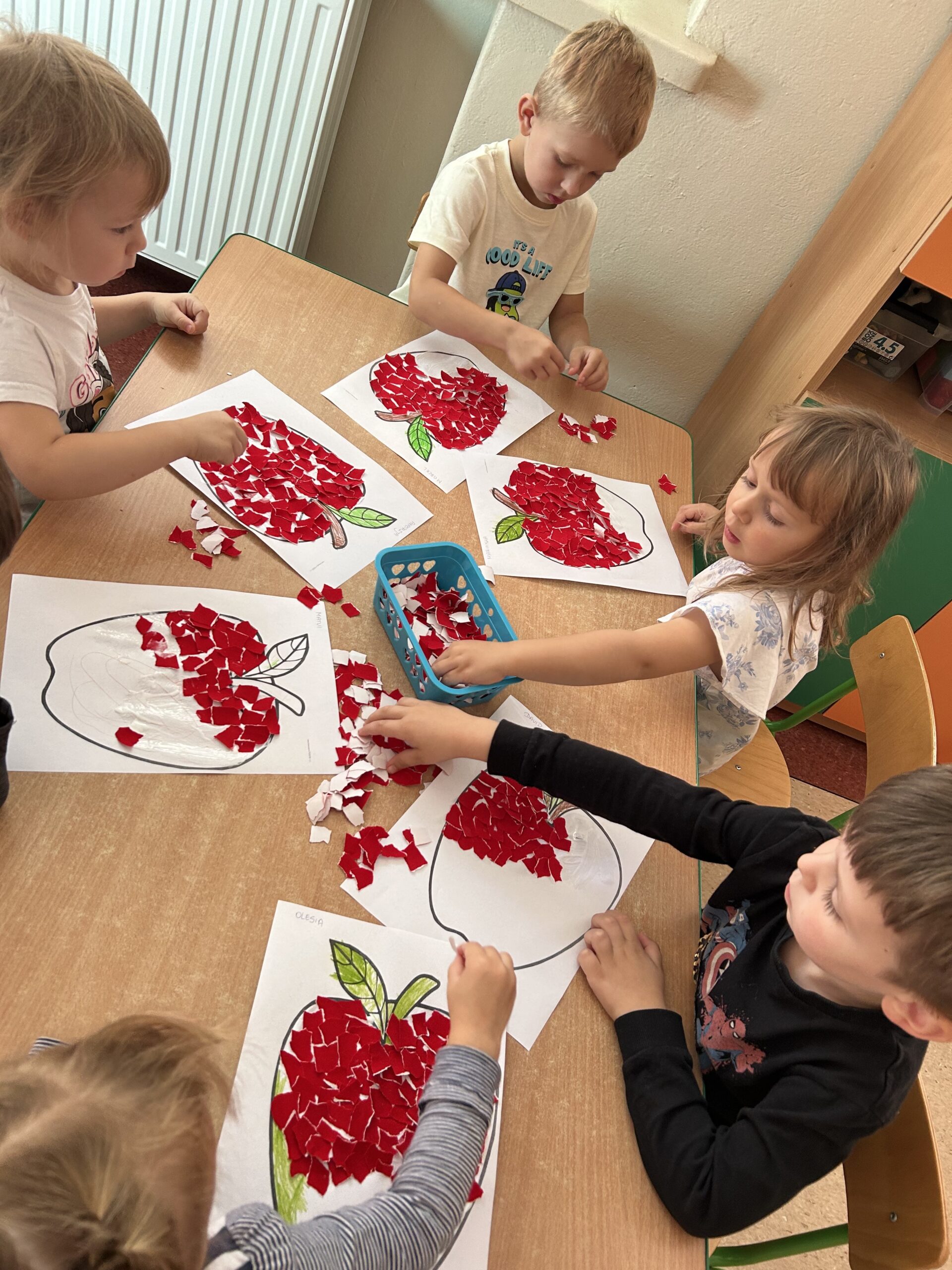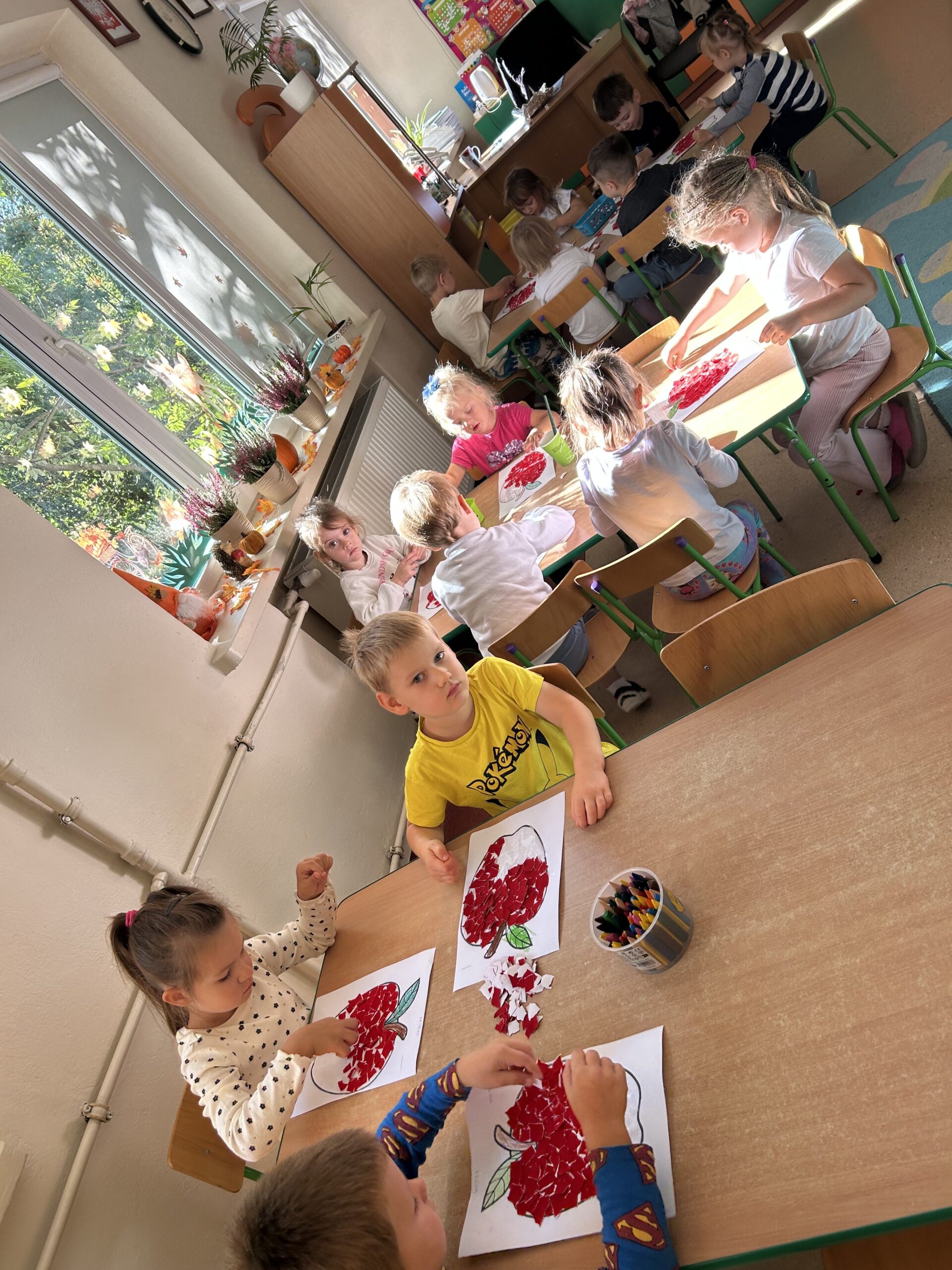W części plastycznej dzieci wykonały prace związane z jabłkiem – powstały czerwone jabłuszka, które pięknie ozdobiły szatnie.