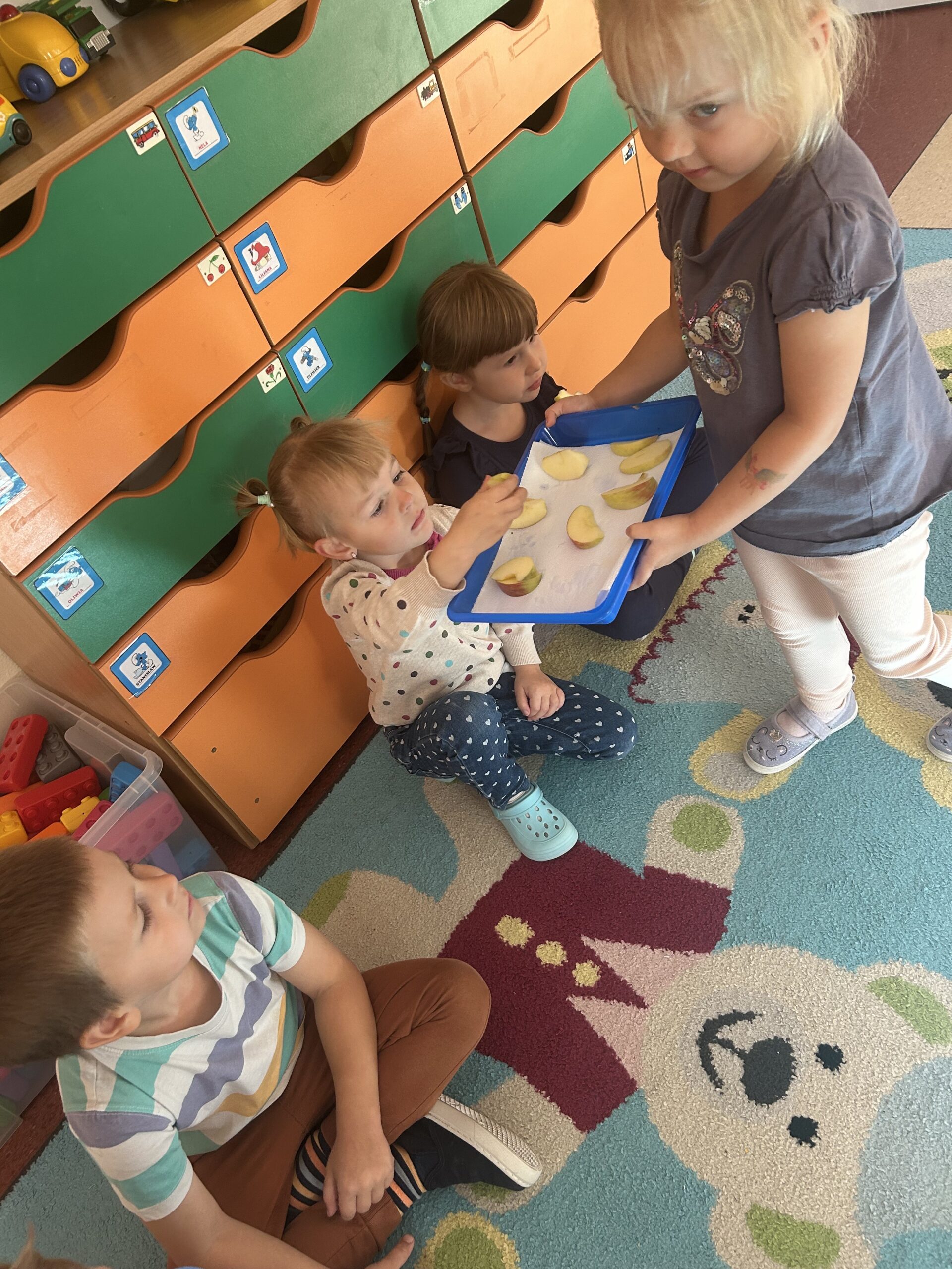 Na początku dzieci poznały budowę jabłka – oglądały je z zewnątrz i od środka, dowiedziały się, że jabłko ma skórkę, miąższ, gniazdo nasienne oraz pestki. Każdy miał okazję obejrzeć przekrojone owoce.