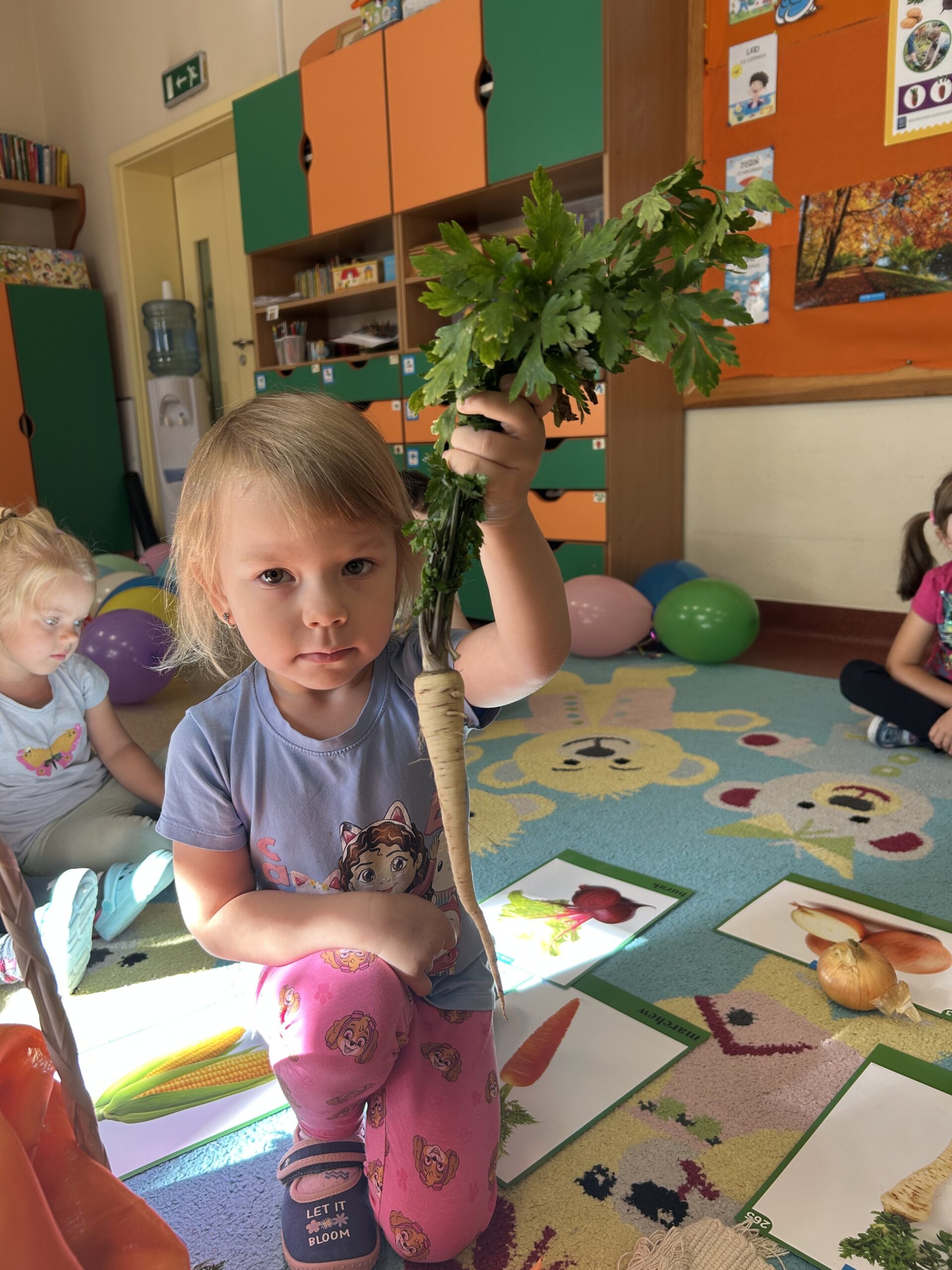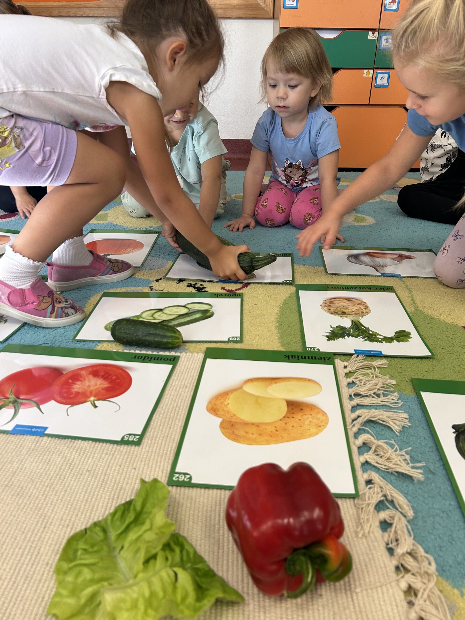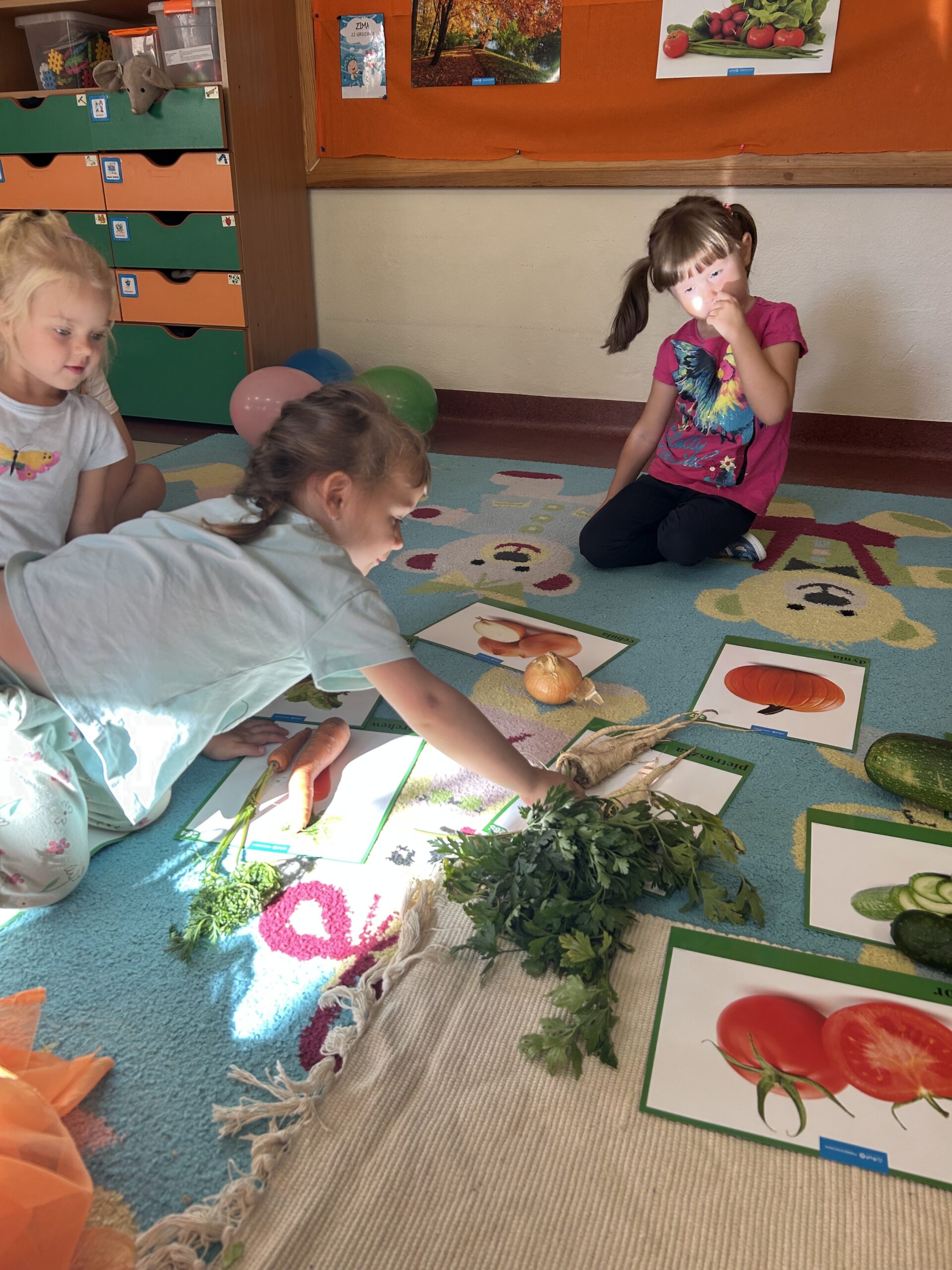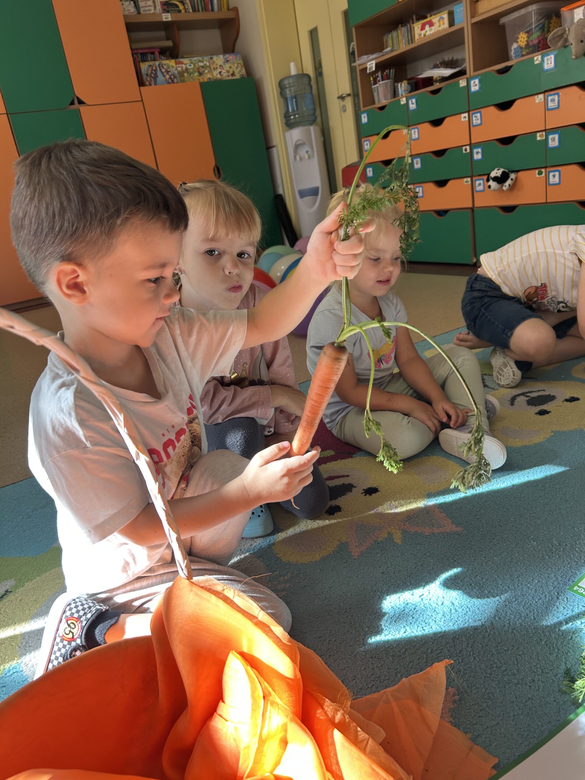 W grupie „Smerfy” zrobiło się dziś naprawdę jesiennie! Dzieci wyruszyły w małą wyprawę do „warzywnego królestwa”. 🌟 Rozpoznawały marchewki, buraczki, cebulki i inne skarby jesieni – dotykały ich, wąchały, a potem dopasowywały do kolorowych ilustracji.