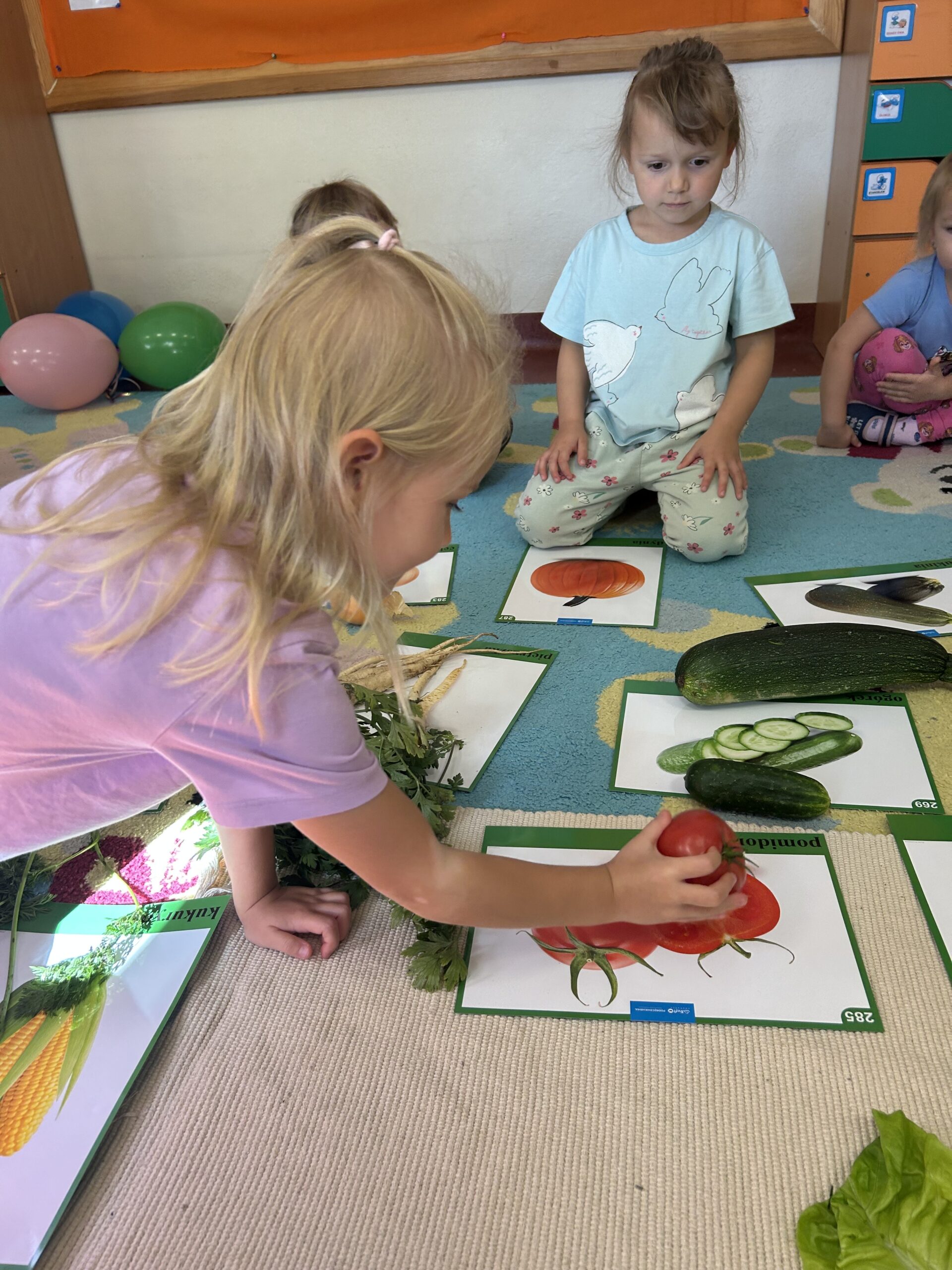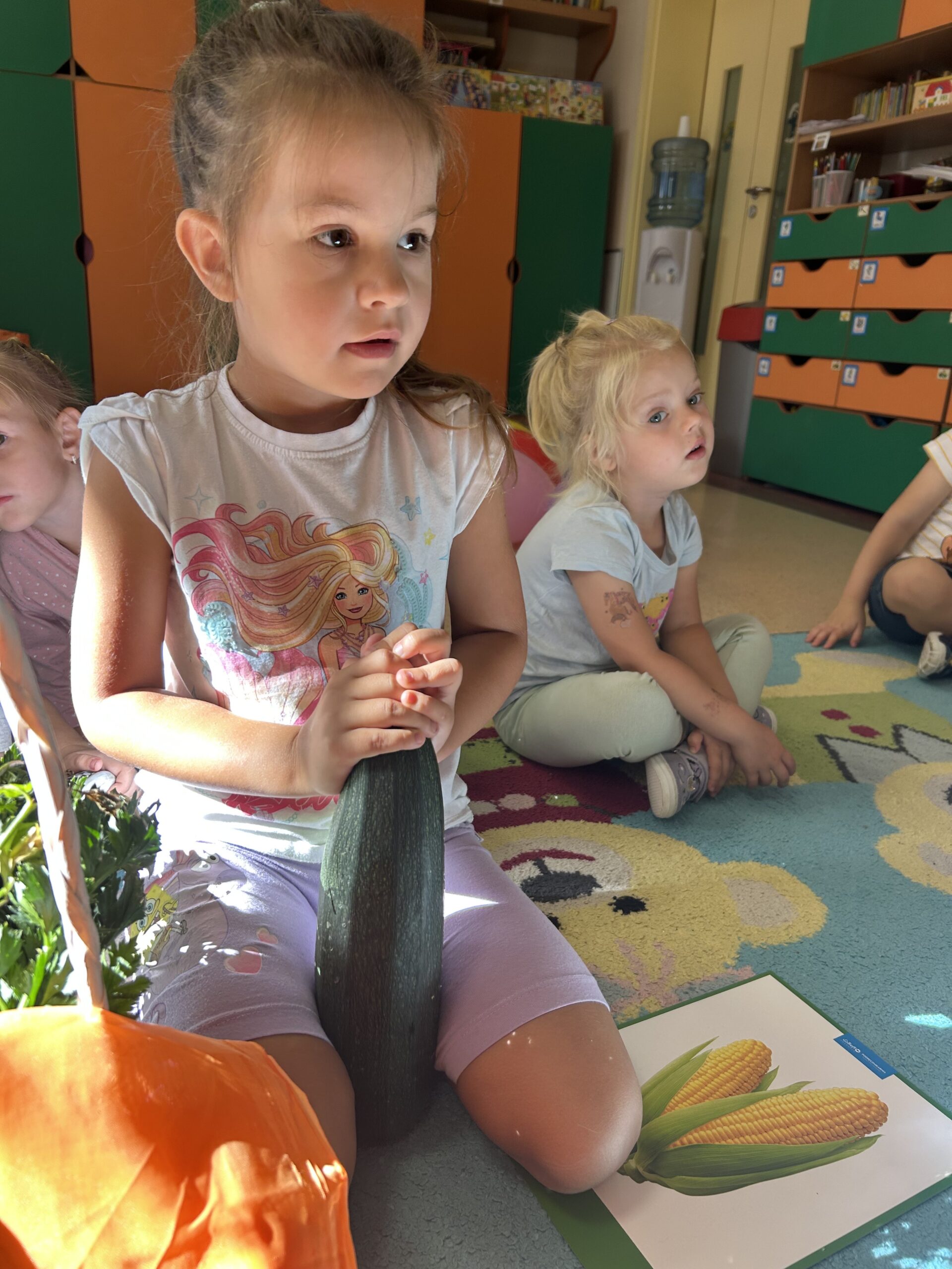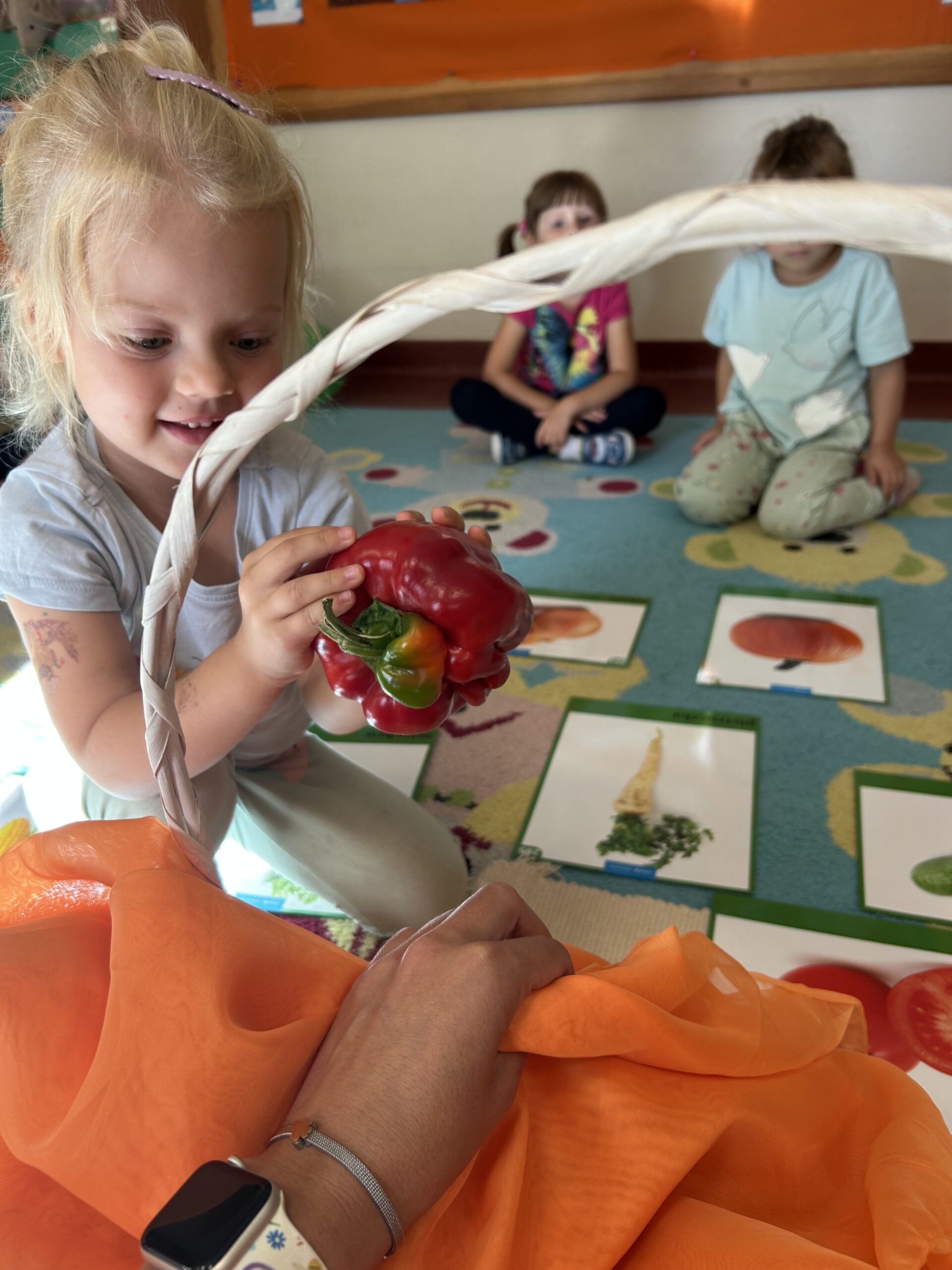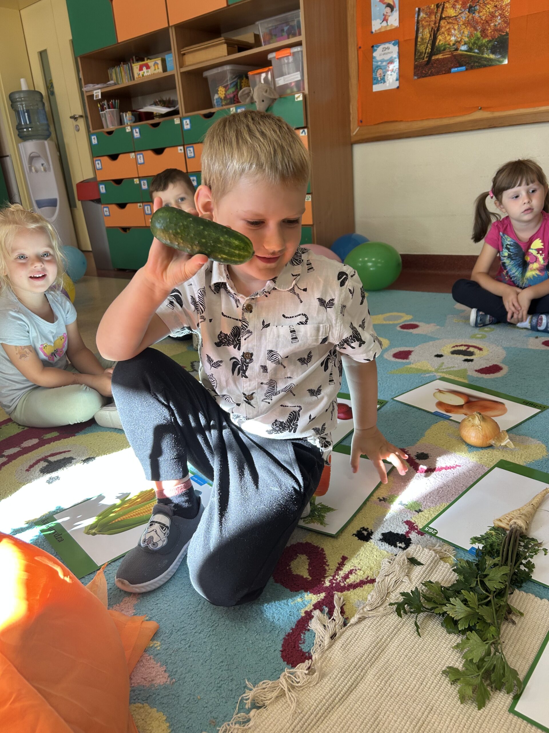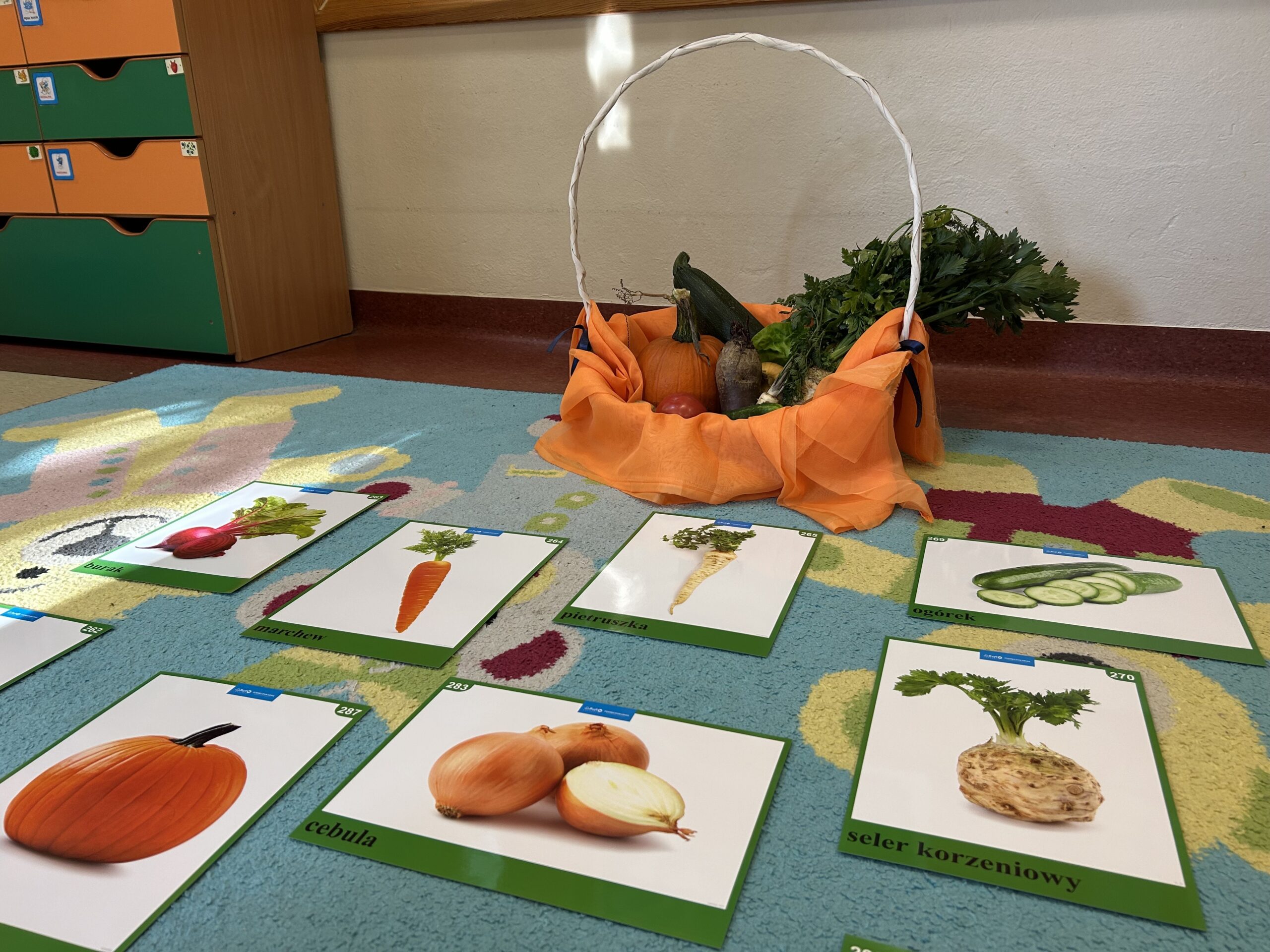 W grupie „Smerfy” zrobiło się dziś naprawdę jesiennie! Dzieci wyruszyły w małą wyprawę do „warzywnego królestwa”. 🌟 Rozpoznawały marchewki, buraczki, cebulki i inne skarby jesieni – dotykały ich, wąchały, a potem dopasowywały do kolorowych ilustracji.