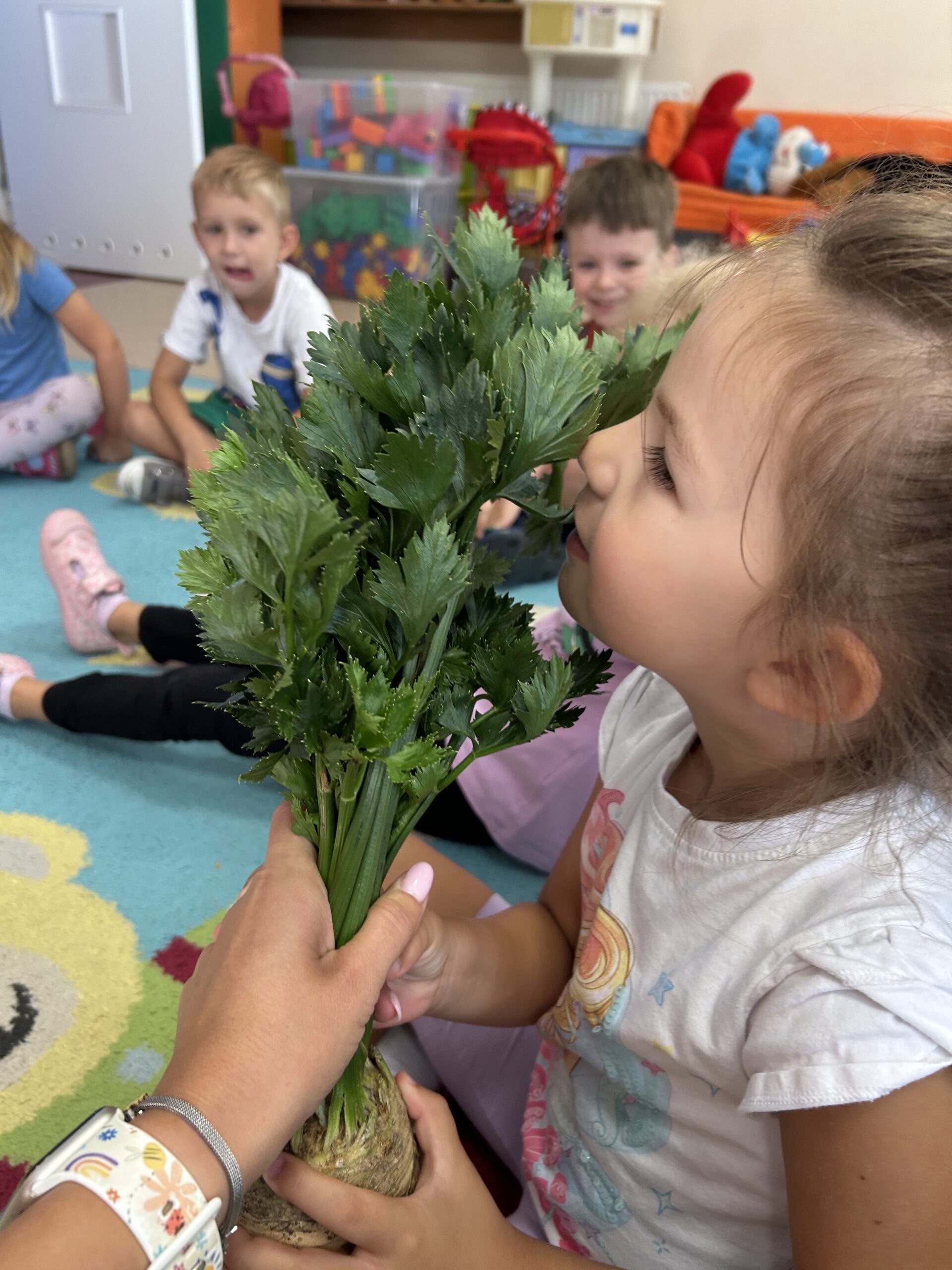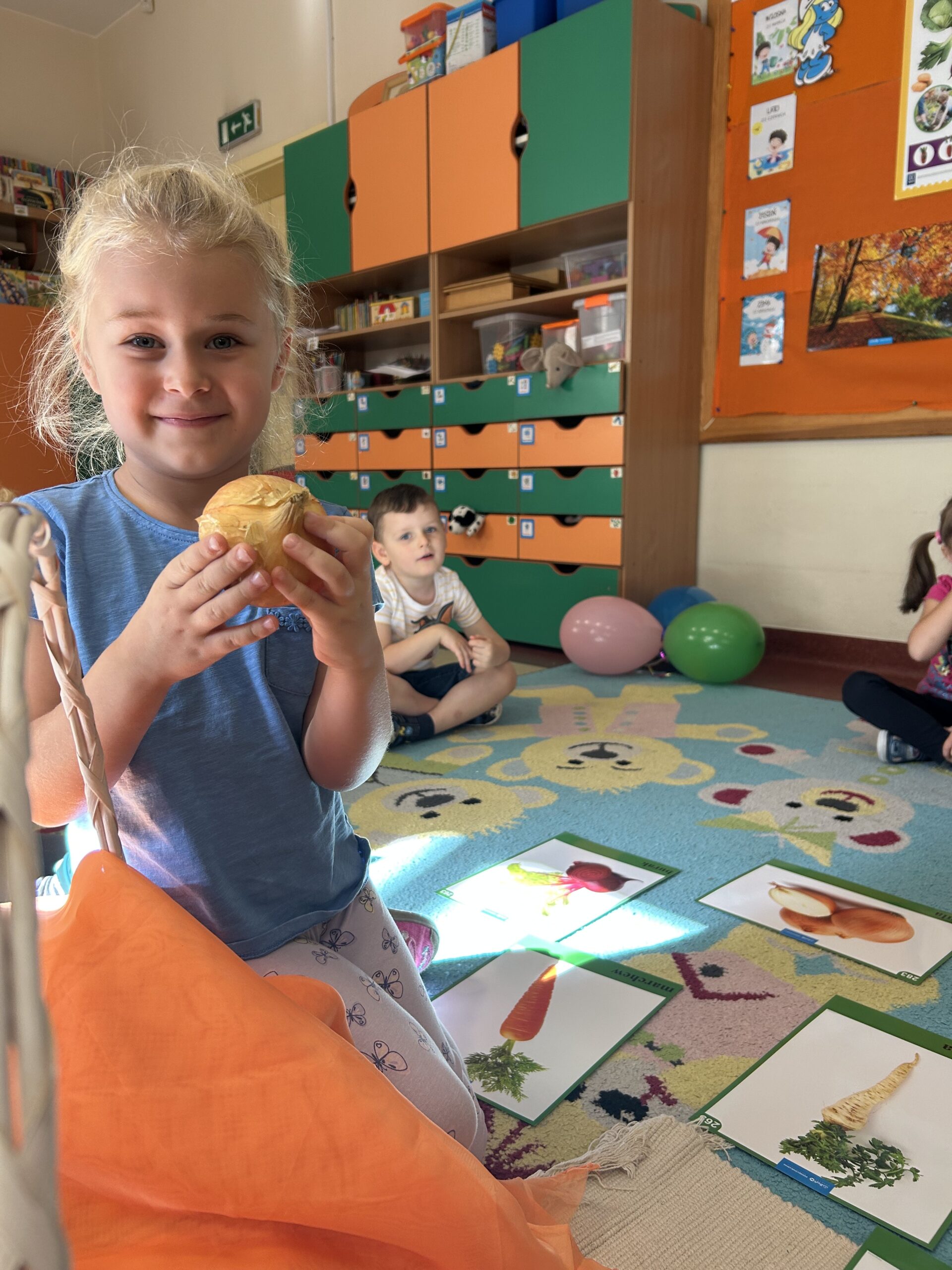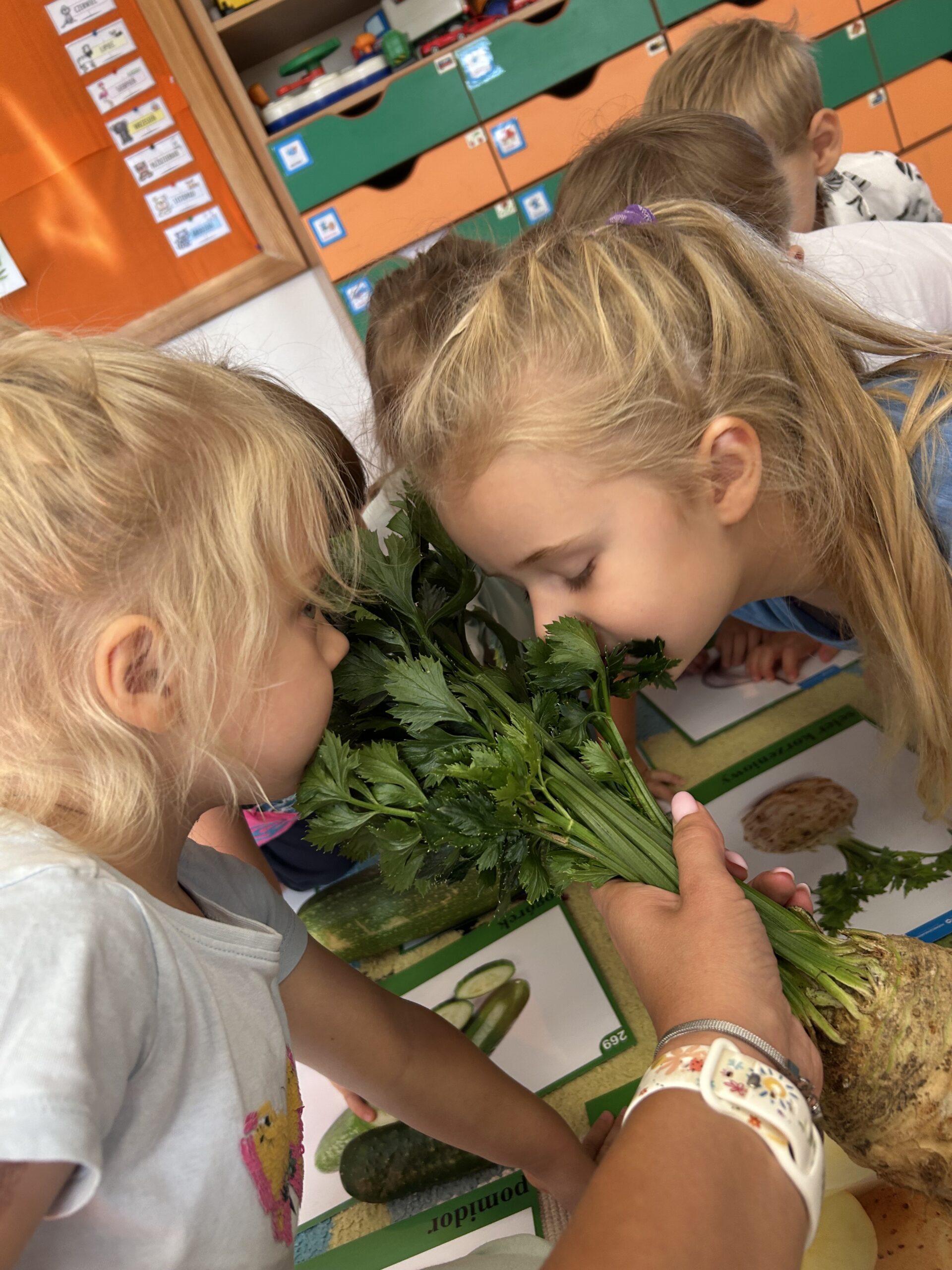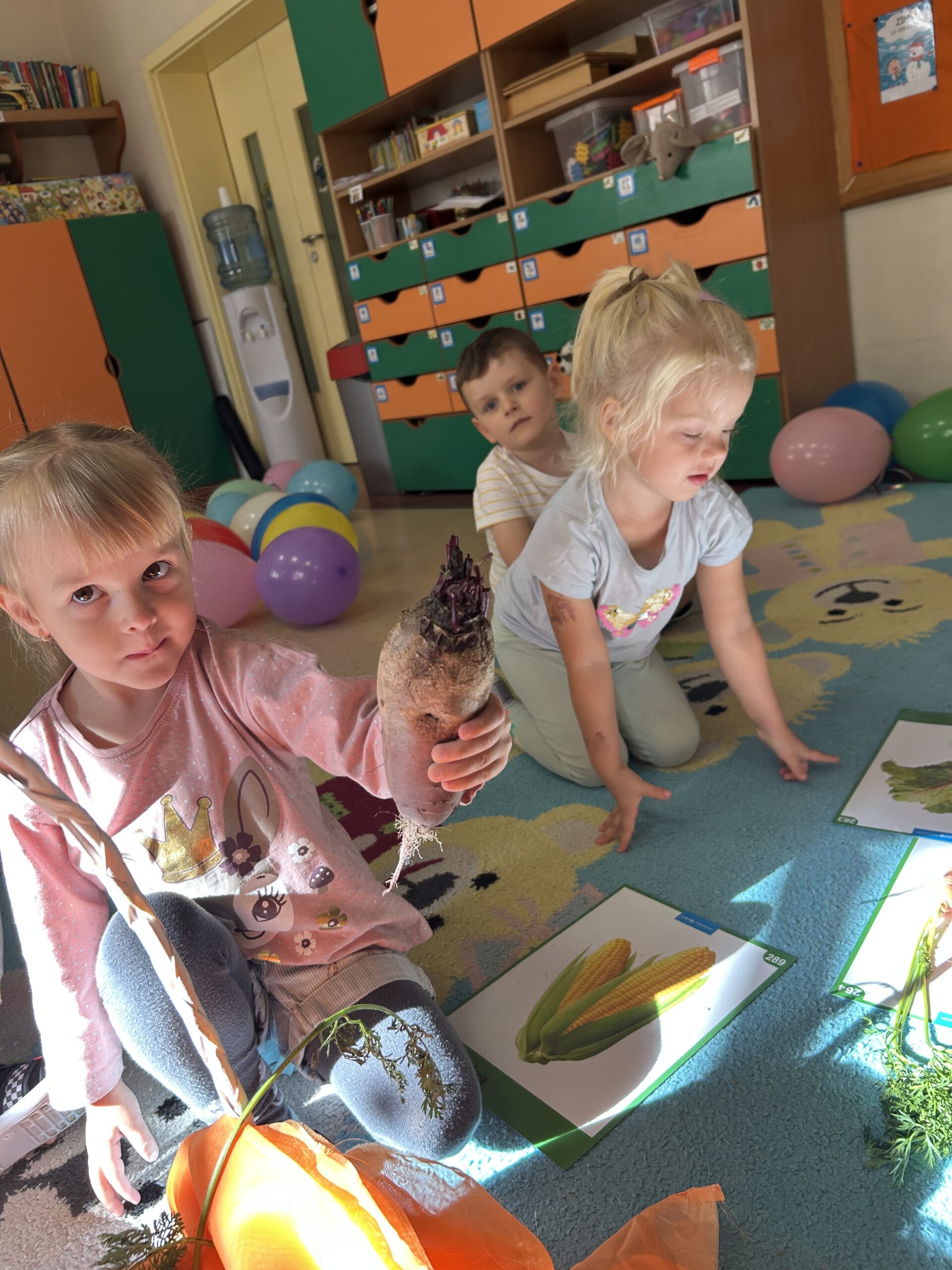 Okazało się, że warzywa mają nie tylko różne kształty i zapachy, ale też kryją w sobie wiele ciekawostek. Przedszkolaki z radością odkrywały, że dzięki takim zdrowym darom jesieni możemy być silni i zdrowi.