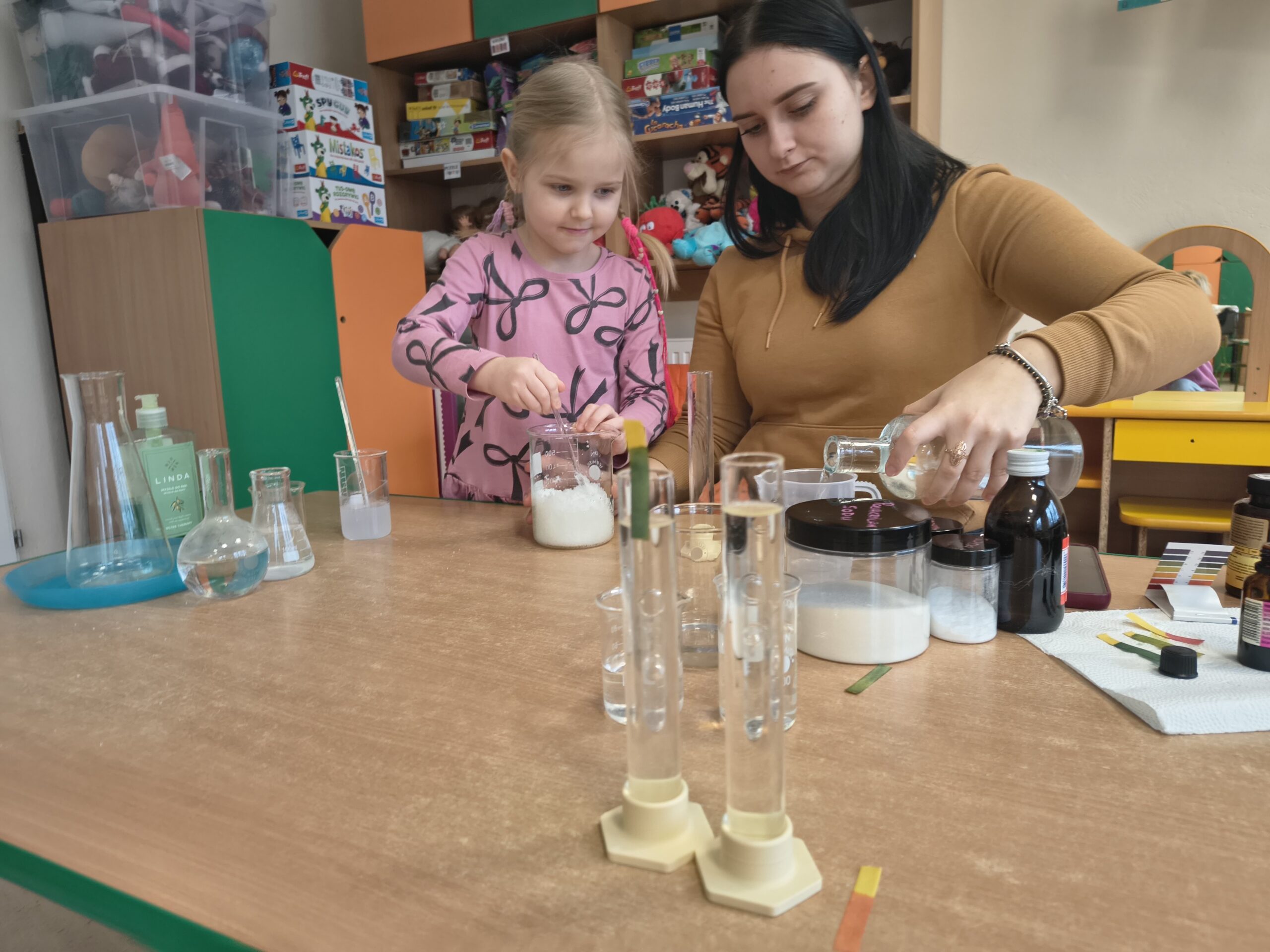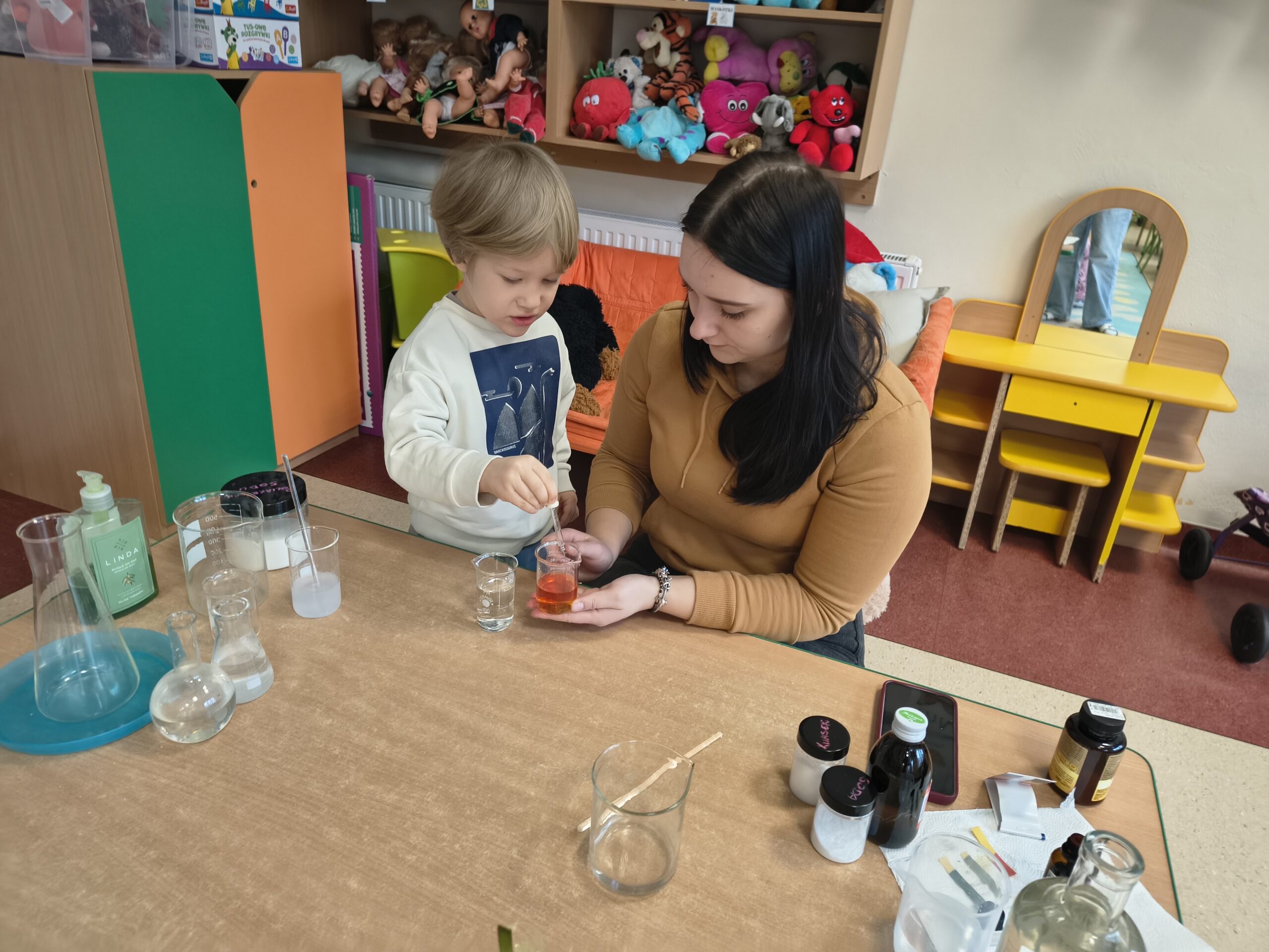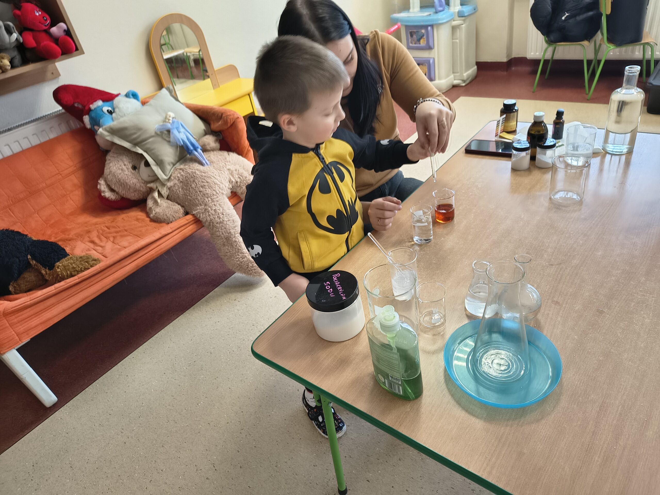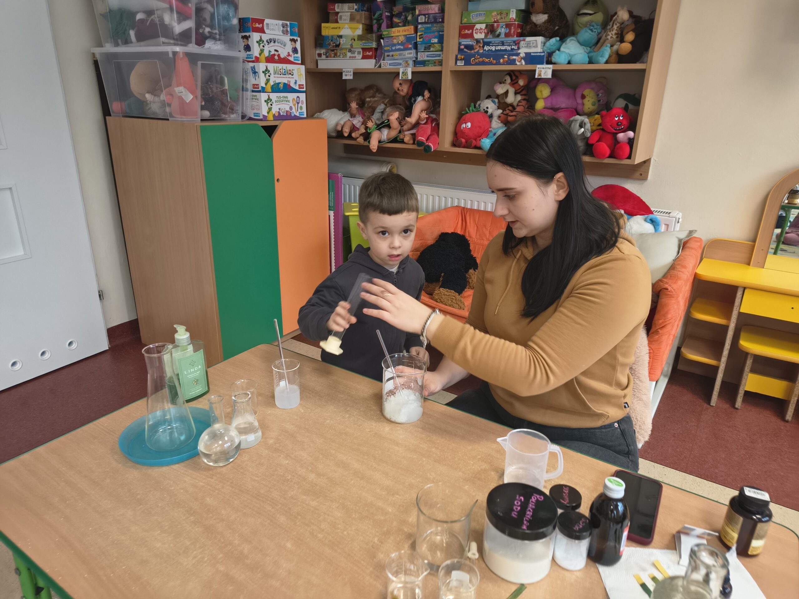 W dniu 04.02.26 grupie Smerfy odbyły się warsztaty chemiczne. Dzieci miały okazję zapoznać się z podstawowym słownictwem chemicznym oraz aktywnie uczestniczyć w prostych, bezpiecznych doświadczeniach. Zajęcia wzbudziły duże zainteresowanie, rozwijały ciekawość poznawczą i zachęcały dzieci do zadawania pytań oraz samodzielnego odkrywania świata nauki.